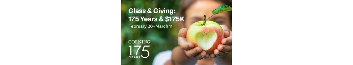 Glass & Giving: 175 Years, $175K. In celebration of Corning's 175 Anniversary, we are teaming up to raise $175,000 to support child hunger relief in our area. Funds will help provide over 1 MILLION meals for child in need.